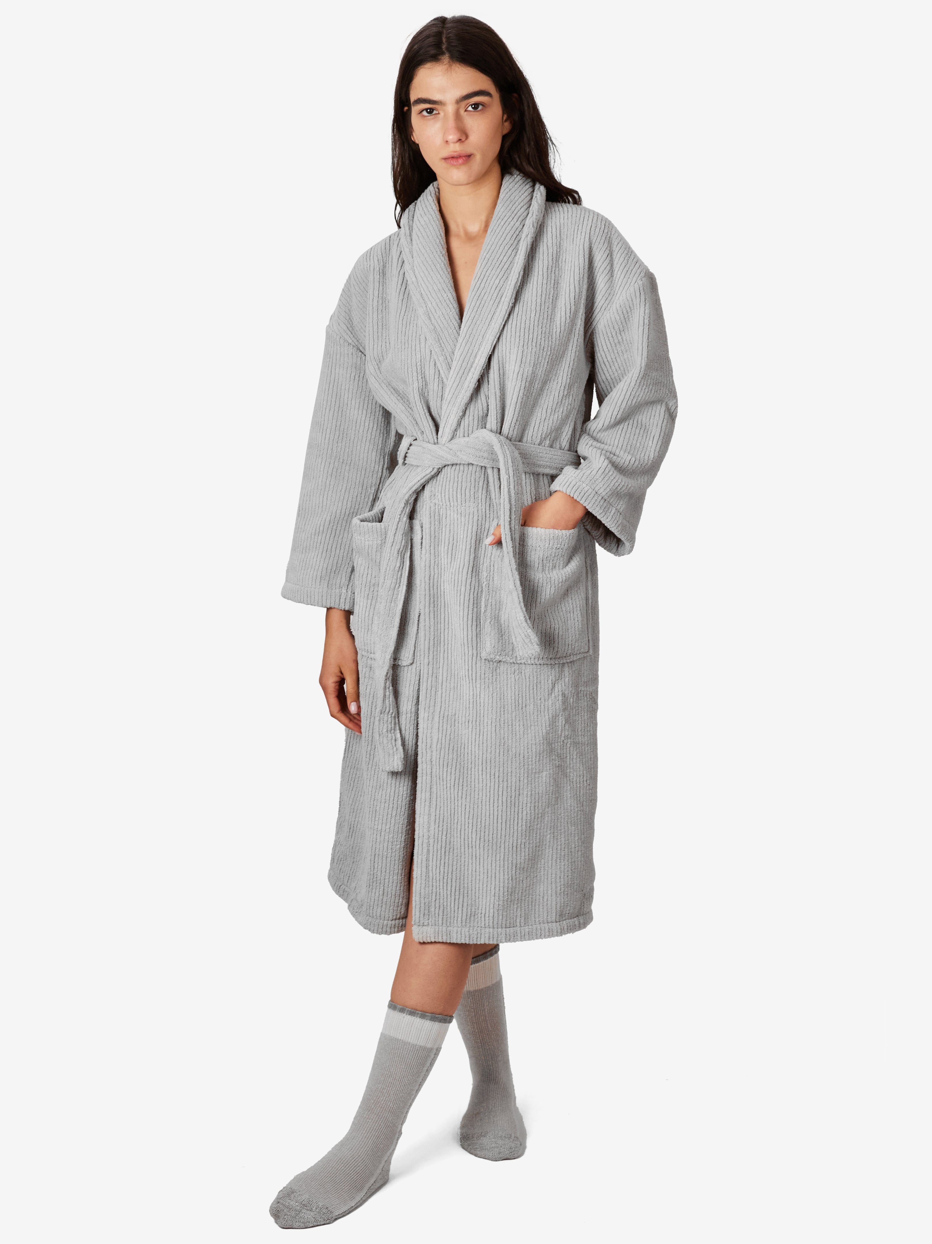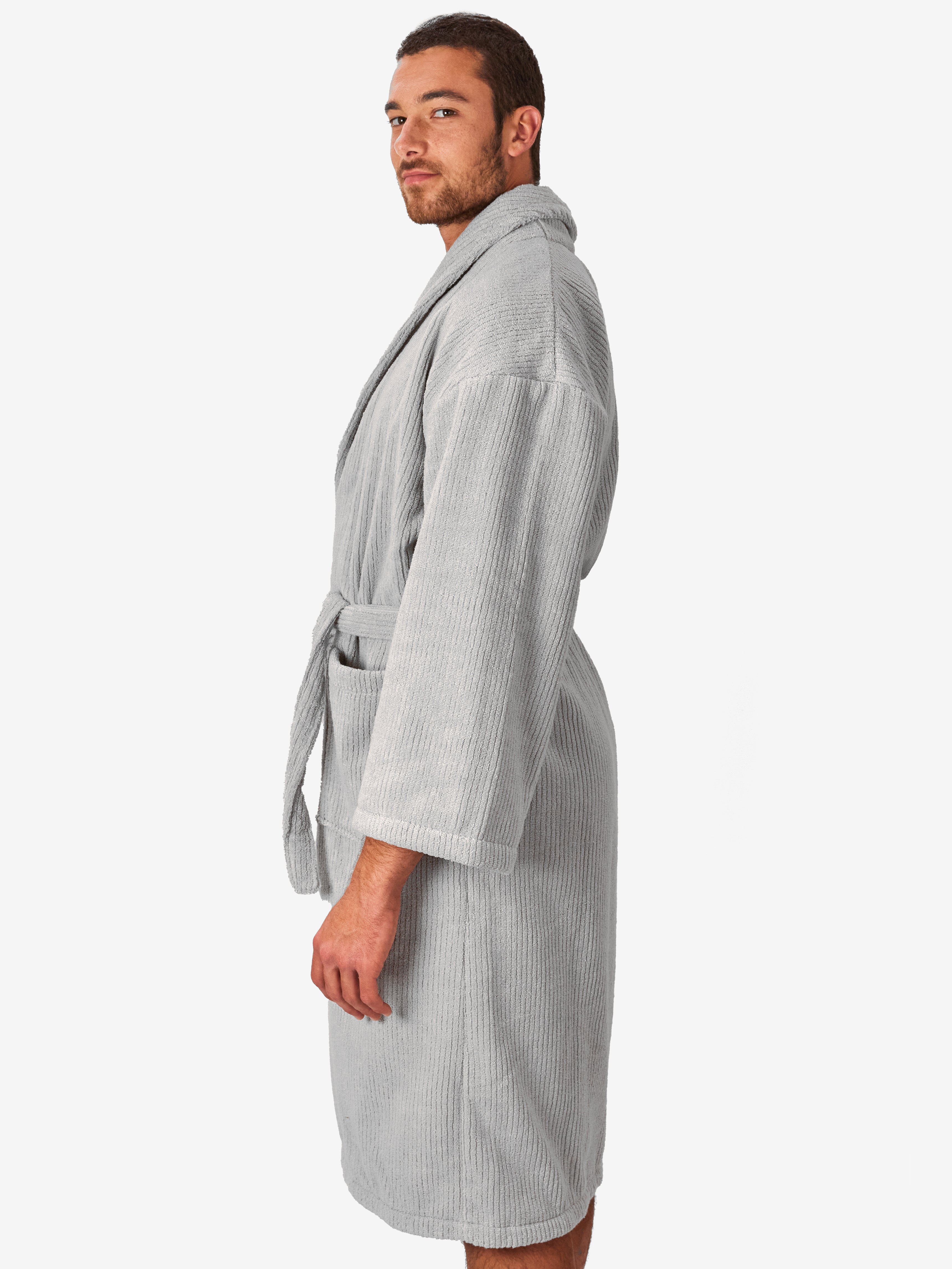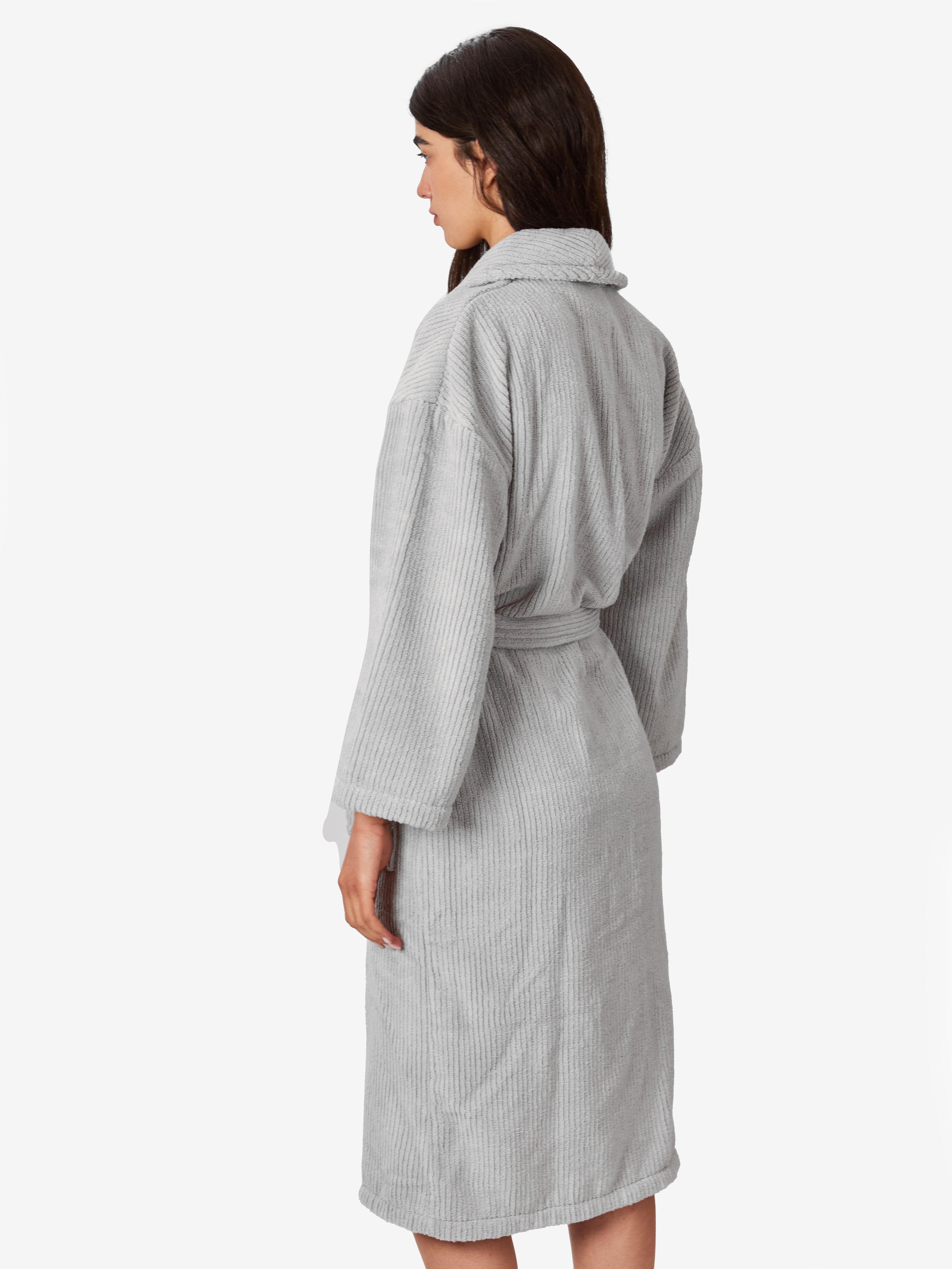 החלוק, עשוי 100% כותנה טורקית ובעל גימור של פסים אנכיים המעניקים לו תחושת רכות מלטפת. מגיע עם כיסים וחגורת מותן, הפריט האולטימטיבי לחווית רחצה שלמה ומהנה.