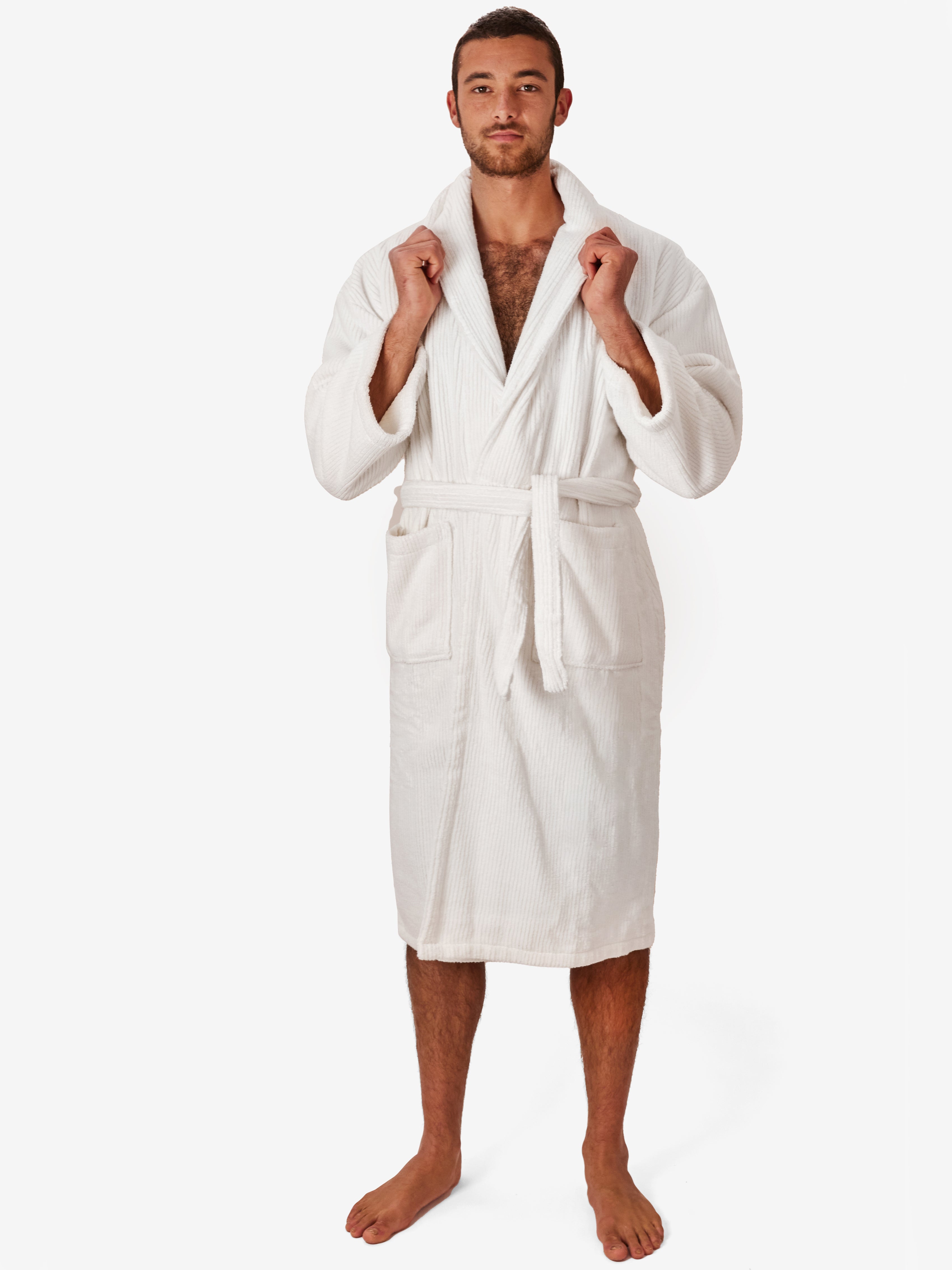 החלוק, עשוי 100% כותנה טורקית ובעל גימור של פסים אנכיים המעניקים לו תחושת רכות מלטפת. מגיע עם כיסים וחגורת מותן, הפריט האולטימטיבי לחווית רחצה שלמה ומהנה.